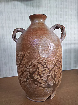 焼成前の段階では赤土(褐色)に「黒」の粘土で梅の幹、「白」と「朱」の粘土で梅の花を象嵌したので、紅白の梅の花が満開の花瓶が仕上がる予定でしたが、焼き上がってみると梅の花は全てほぼ同じ色に焼きあがりました。